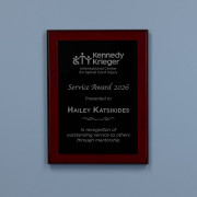 Defined by its rich cherry finish and high-gloss depth, the Ember Plaque brings warmth and energy to traditional recognition. A black plate that engraves to silver, delivering sleek contrast and refined detail. A contemporary option with strong clarity and presence.